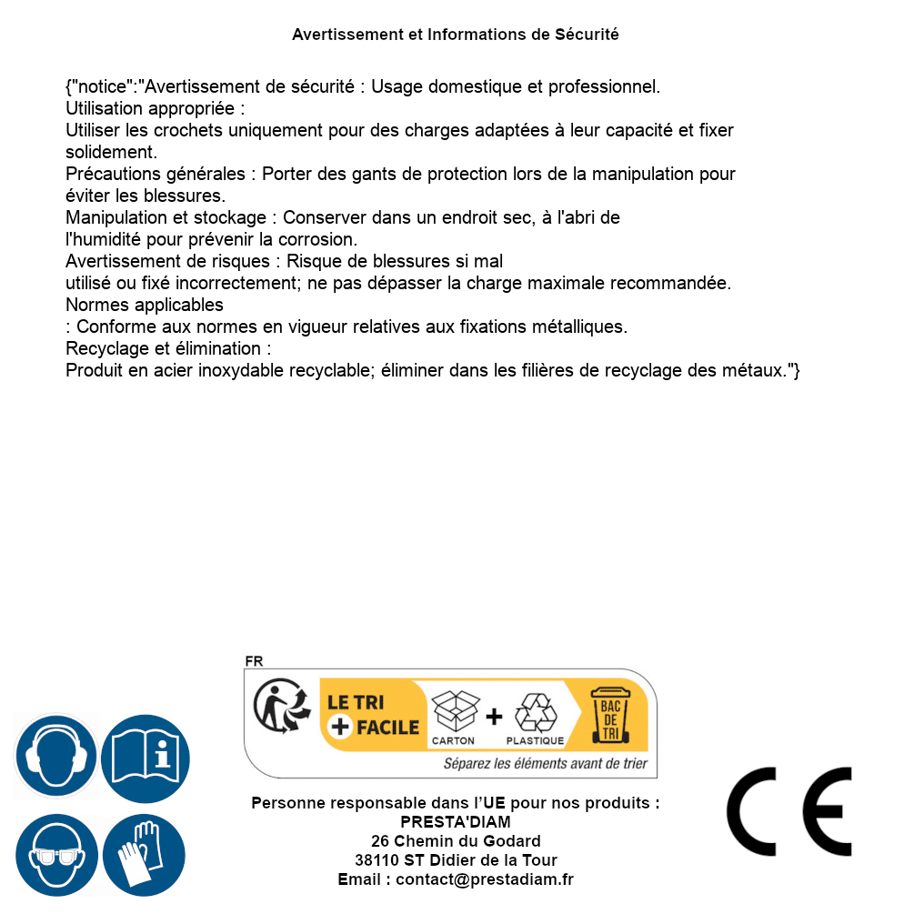 | AVERTISSEMENT et SECURITE | Identification de la personne responsable dans l’UE : Nom : PRESTA'DIAM. Adresse : 26 Chemin du Godard, 38110 ST Didier de la Tour (France). Email : contact@prestadiam.fr. |
