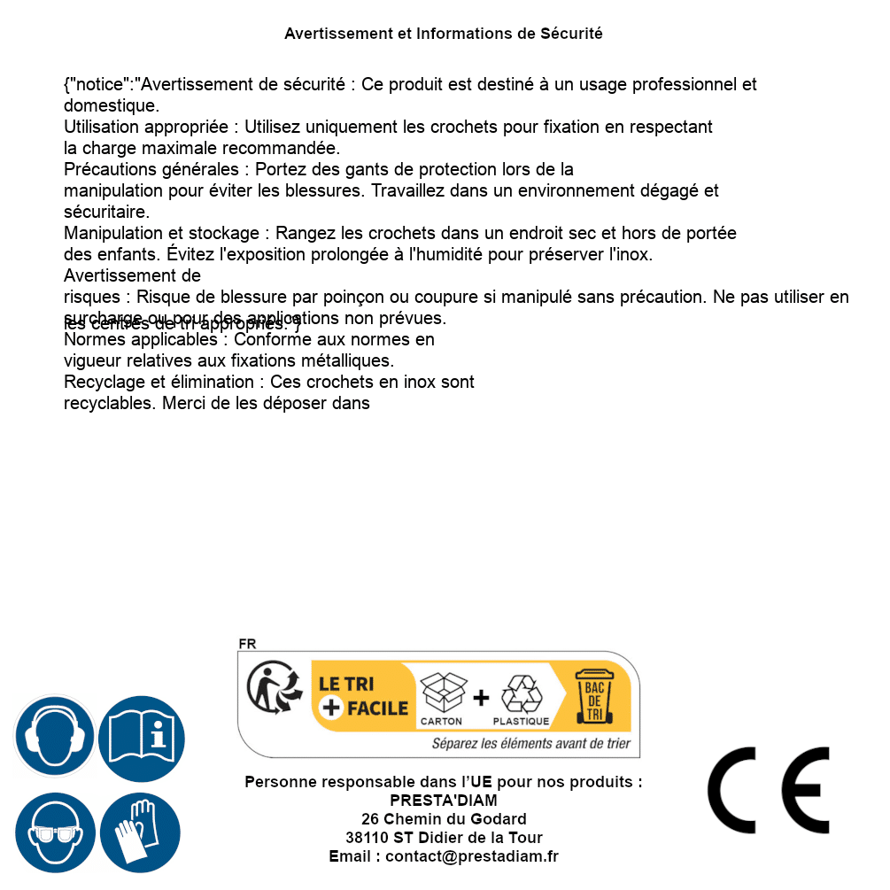| AVERTISSEMENT et SECURITE | Identification de la personne responsable dans l’UE : Nom : PRESTA'DIAM. Adresse : 26 Chemin du Godard, 38110 ST Didier de la Tour (France). Email : contact@prestadiam.fr. |