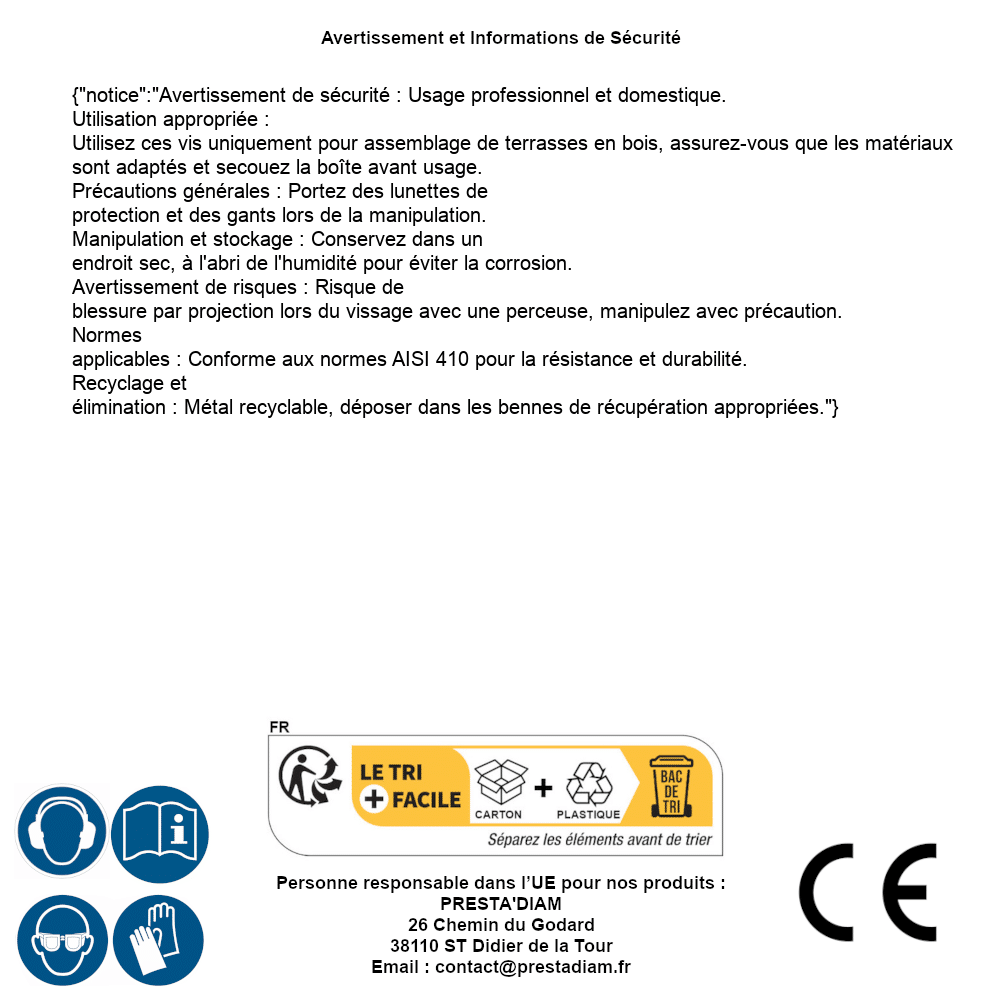 | AVERTISSEMENT et SECURITE | Identification de la personne responsable dans l’UE : Nom : PRESTA'DIAM. Adresse : 26 Chemin du Godard, 38110 ST Didier de la Tour (France). Email : contact@prestadiam.fr. |