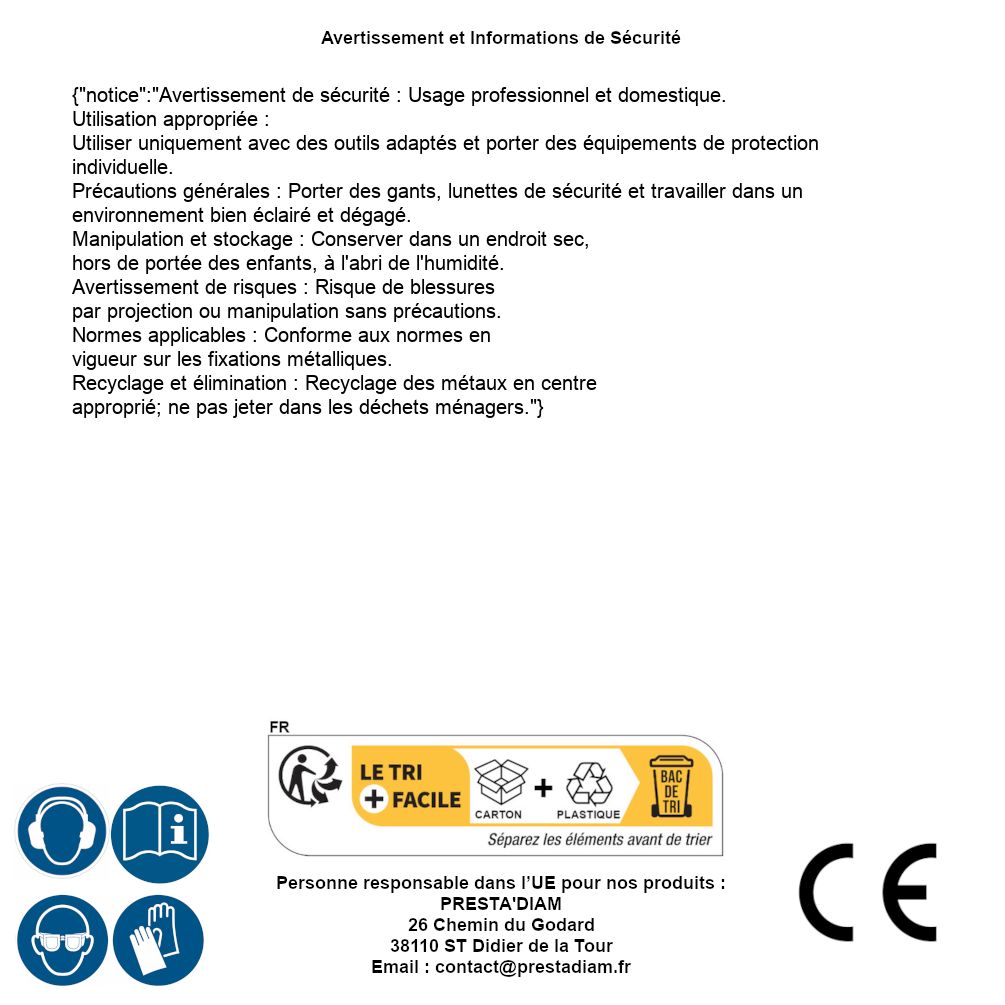 | AVERTISSEMENT et SECURITE | Identification de la personne responsable dans l’UE : Nom : PRESTA'DIAM. Adresse : 26 Chemin du Godard, 38110 ST Didier de la Tour (France). Email : contact@prestadiam.fr. |