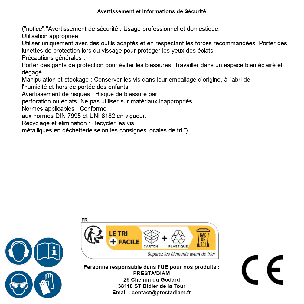 | AVERTISSEMENT et SECURITE | Identification de la personne responsable dans l’UE : Nom : PRESTA'DIAM. Adresse : 26 Chemin du Godard, 38110 ST Didier de la Tour (France). Email : contact@prestadiam.fr. |