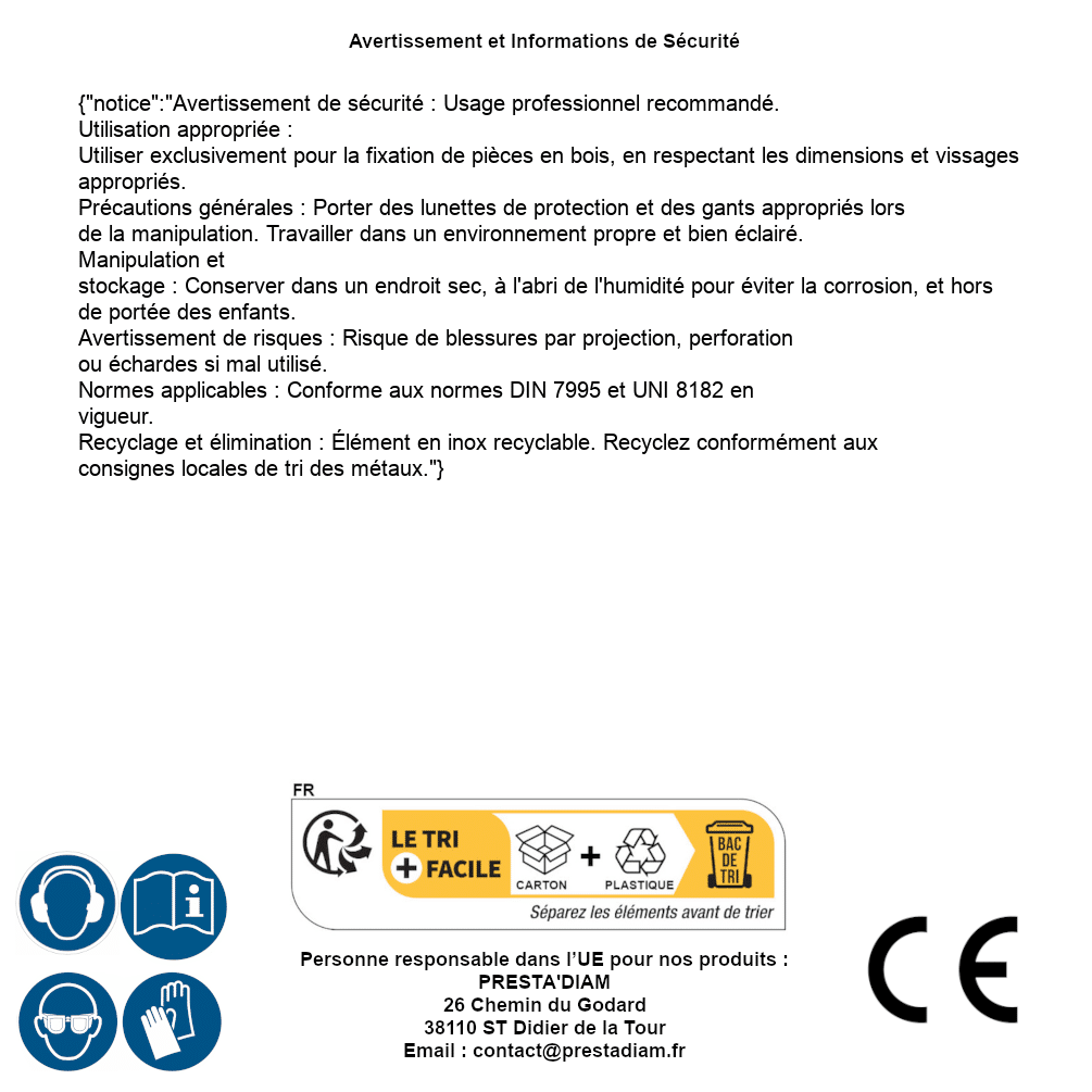 | AVERTISSEMENT et SECURITE | Identification de la personne responsable dans l’UE : Nom : PRESTA'DIAM. Adresse : 26 Chemin du Godard, 38110 ST Didier de la Tour (France). Email : contact@prestadiam.fr. |