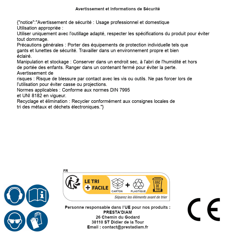 | AVERTISSEMENT et SECURITE | Identification de la personne responsable dans l’UE : Nom : PRESTA'DIAM. Adresse : 26 Chemin du Godard, 38110 ST Didier de la Tour (France). Email : contact@prestadiam.fr. |