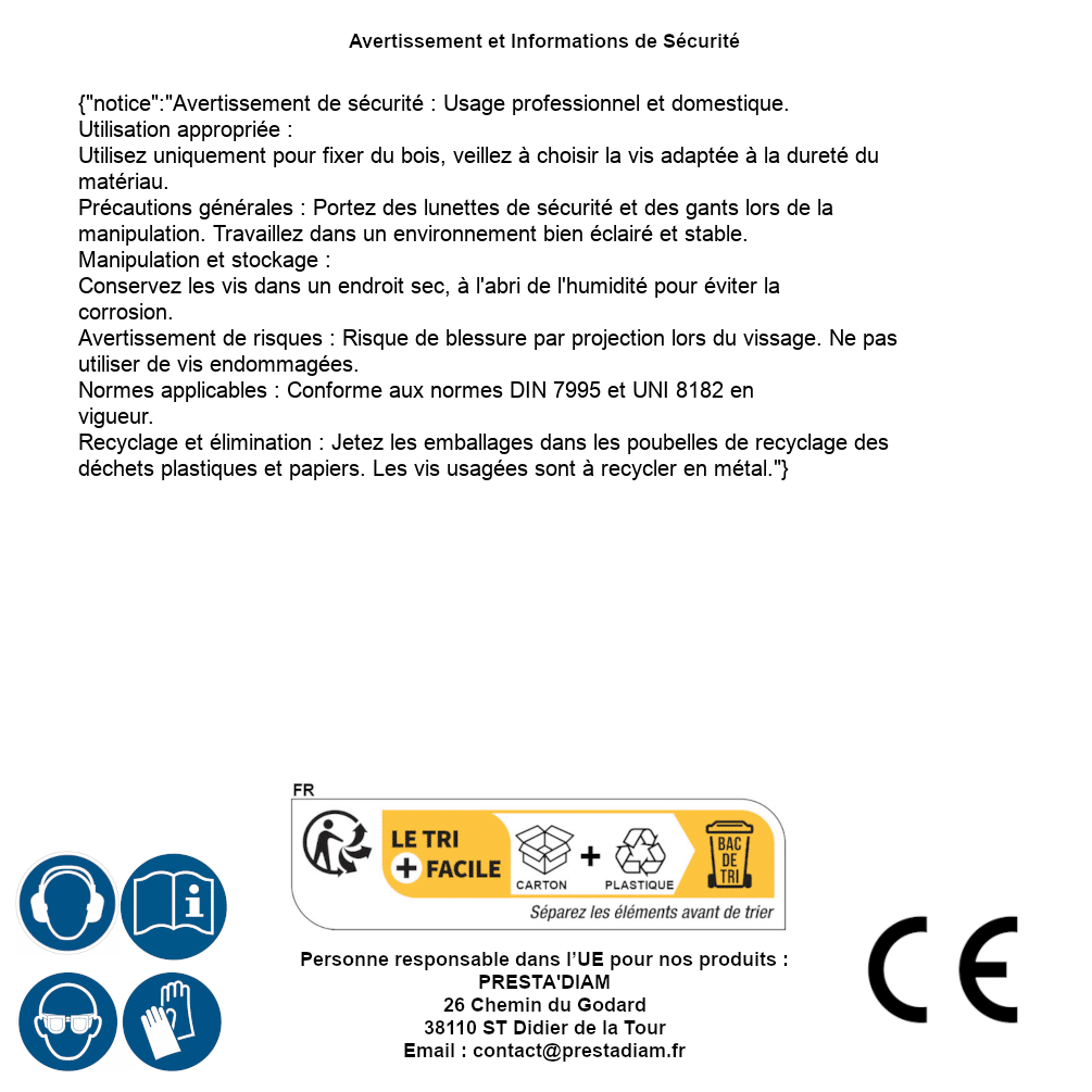 | AVERTISSEMENT et SECURITE | Identification de la personne responsable dans l’UE : Nom : PRESTA'DIAM. Adresse : 26 Chemin du Godard, 38110 ST Didier de la Tour (France). Email : contact@prestadiam.fr. |