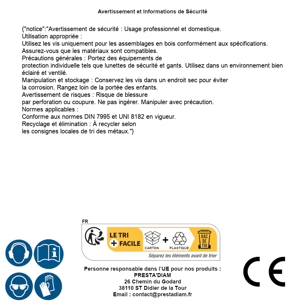 | AVERTISSEMENT et SECURITE | Identification de la personne responsable dans l’UE : Nom : PRESTA'DIAM. Adresse : 26 Chemin du Godard, 38110 ST Didier de la Tour (France). Email : contact@prestadiam.fr. |