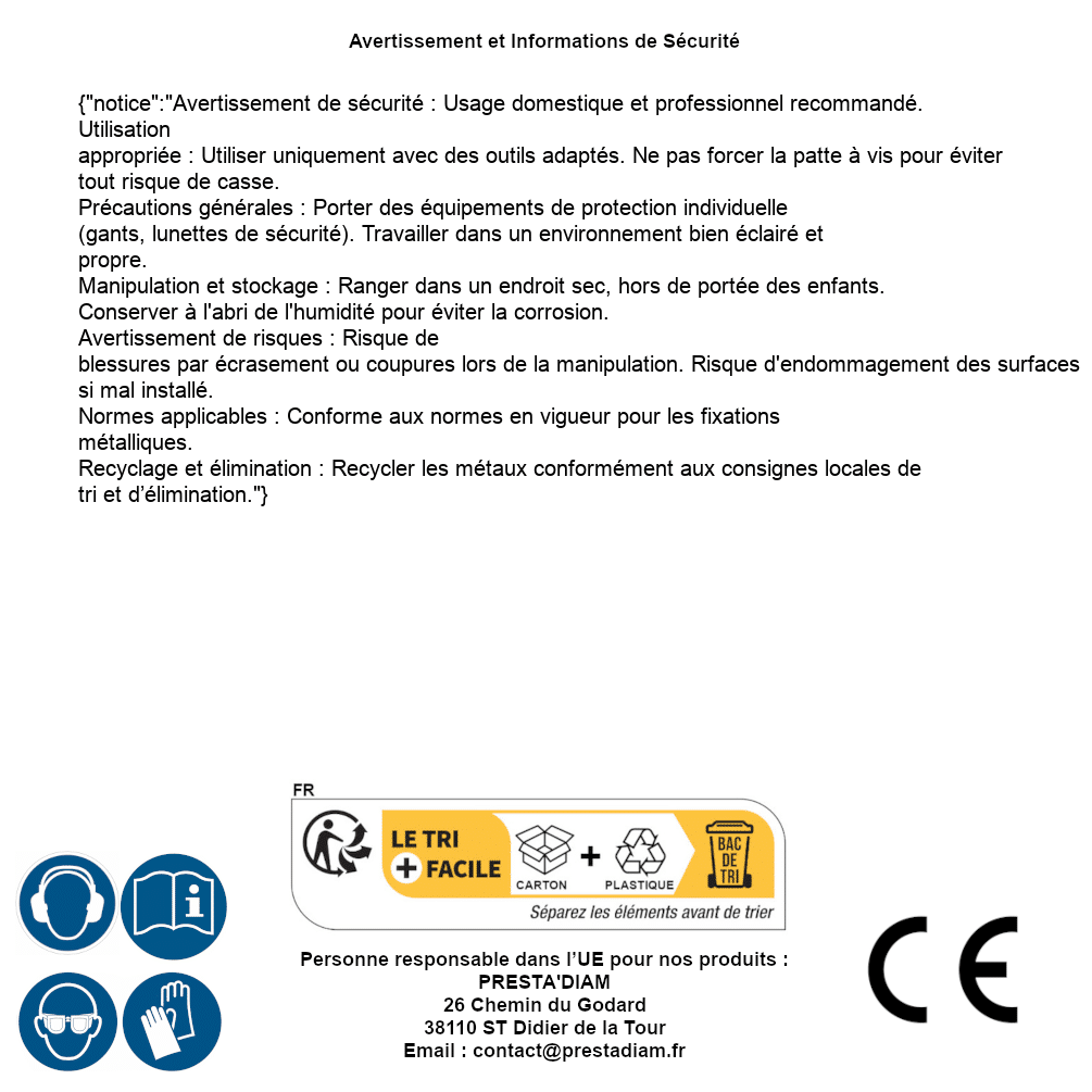 | AVERTISSEMENT et SECURITE | Identification de la personne responsable dans l’UE : Nom : PRESTA'DIAM. Adresse : 26 Chemin du Godard, 38110 ST Didier de la Tour (France). Email : contact@prestadiam.fr. |