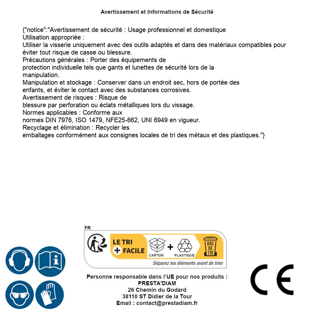 | AVERTISSEMENT et SECURITE | Identification de la personne responsable dans l’UE : Nom : PRESTA'DIAM. Adresse : 26 Chemin du Godard, 38110 ST Didier de la Tour (France). Email : contact@prestadiam.fr. |