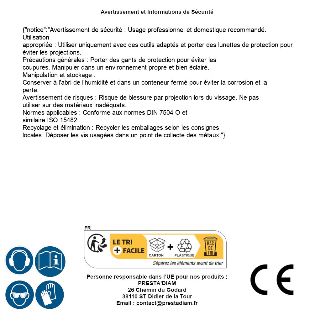 | AVERTISSEMENT et SECURITE | Identification de la personne responsable dans l’UE : Nom : PRESTA'DIAM. Adresse : 26 Chemin du Godard, 38110 ST Didier de la Tour (France). Email : contact@prestadiam.fr. |