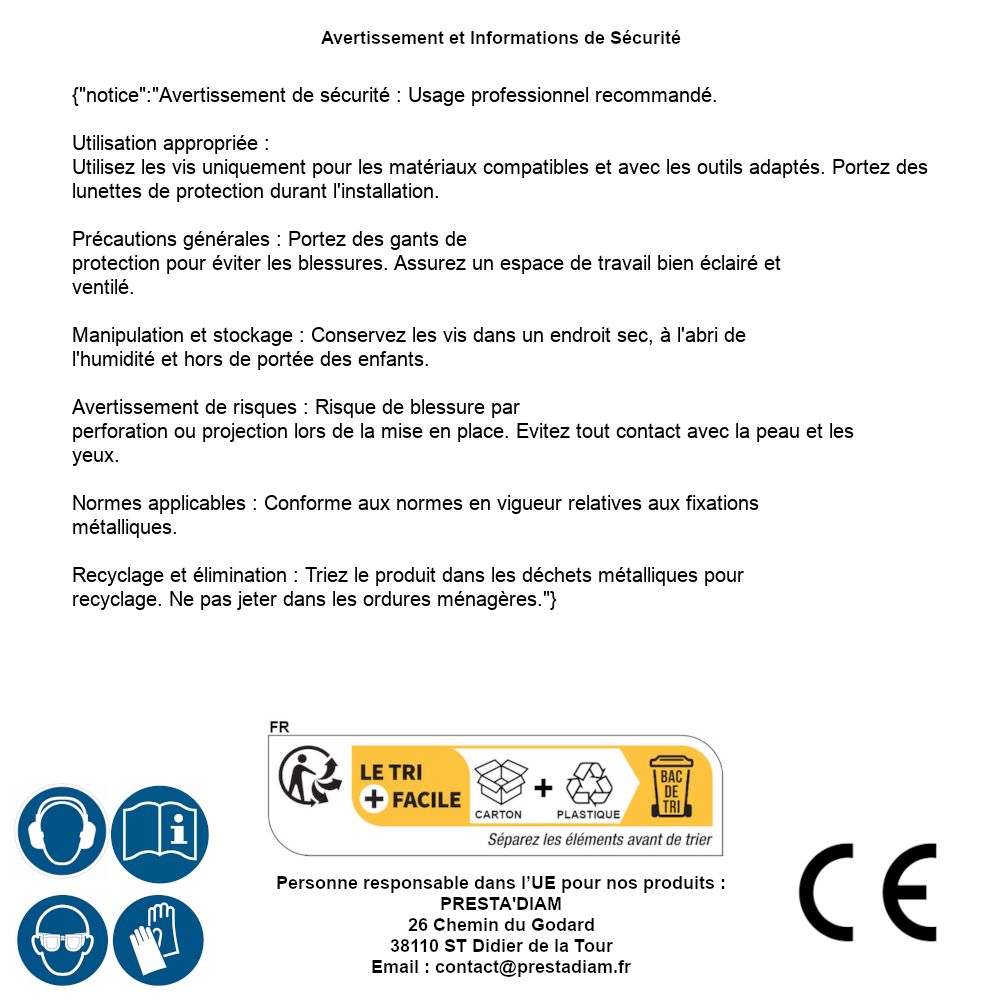 | AVERTISSEMENT et SECURITE | Identification de la personne responsable dans l’UE : Nom : PRESTA'DIAM. Adresse : 26 Chemin du Godard, 38110 ST Didier de la Tour (France). Email : contact@prestadiam.fr. |