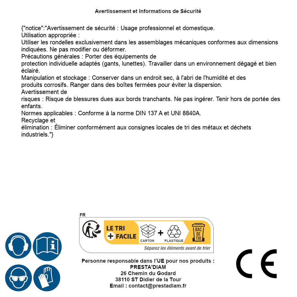 | AVERTISSEMENT et SECURITE | Identification de la personne responsable dans l’UE : Nom : PRESTA'DIAM. Adresse : 26 Chemin du Godard, 38110 ST Didier de la Tour (France). Email : contact@prestadiam.fr. |