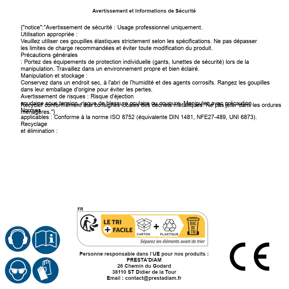 | AVERTISSEMENT et SECURITE | Identification de la personne responsable dans l’UE : Nom : PRESTA'DIAM. Adresse : 26 Chemin du Godard, 38110 ST Didier de la Tour (France). Email : contact@prestadiam.fr. |
