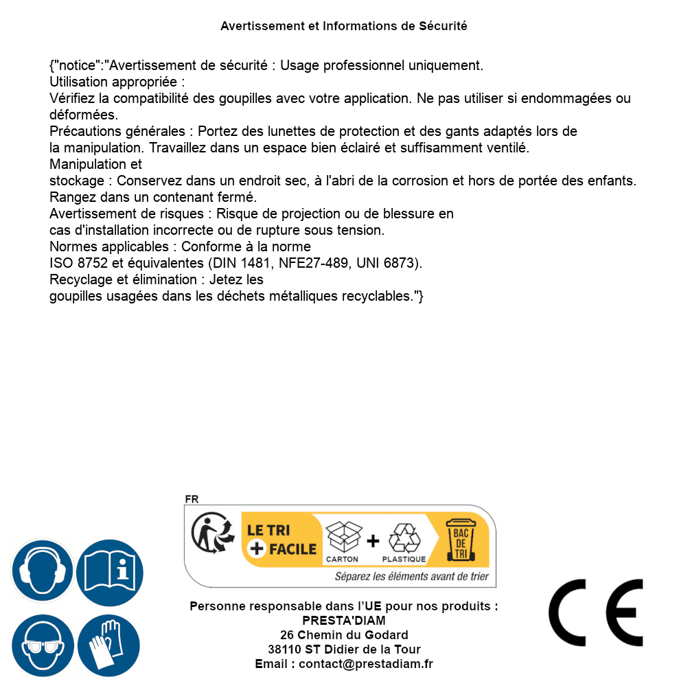 | AVERTISSEMENT et SECURITE | Identification de la personne responsable dans l’UE : Nom : PRESTA'DIAM. Adresse : 26 Chemin du Godard, 38110 ST Didier de la Tour (France). Email : contact@prestadiam.fr. |