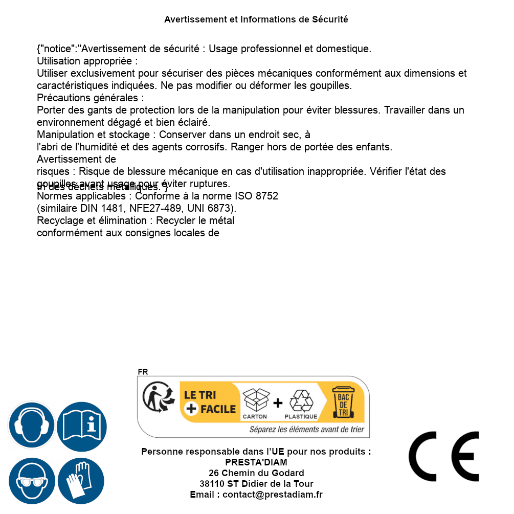 | AVERTISSEMENT et SECURITE | Identification de la personne responsable dans l’UE : Nom : PRESTA'DIAM. Adresse : 26 Chemin du Godard, 38110 ST Didier de la Tour (France). Email : contact@prestadiam.fr. |