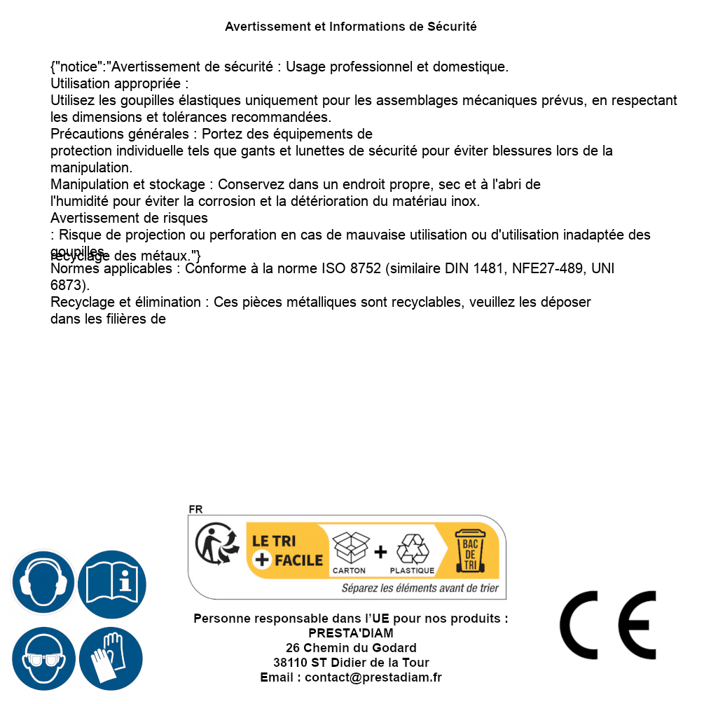 | AVERTISSEMENT et SECURITE | Identification de la personne responsable dans l’UE : Nom : PRESTA'DIAM. Adresse : 26 Chemin du Godard, 38110 ST Didier de la Tour (France). Email : contact@prestadiam.fr. |