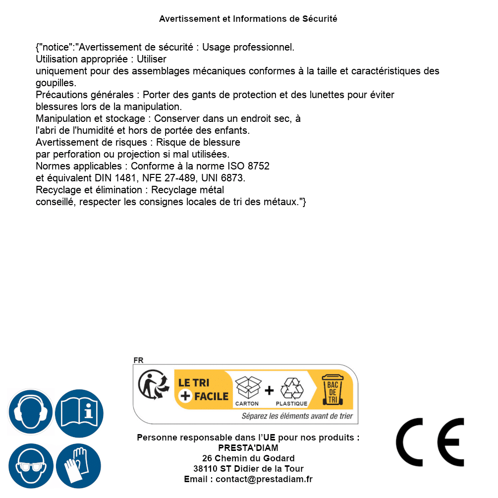 | AVERTISSEMENT et SECURITE | Identification de la personne responsable dans l’UE : Nom : PRESTA'DIAM. Adresse : 26 Chemin du Godard, 38110 ST Didier de la Tour (France). Email : contact@prestadiam.fr. |