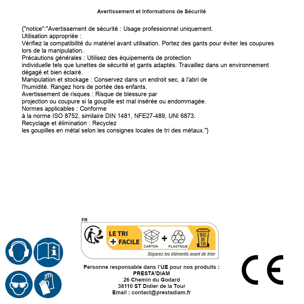 | AVERTISSEMENT et SECURITE | Identification de la personne responsable dans l’UE : Nom : PRESTA'DIAM. Adresse : 26 Chemin du Godard, 38110 ST Didier de la Tour (France). Email : contact@prestadiam.fr. |