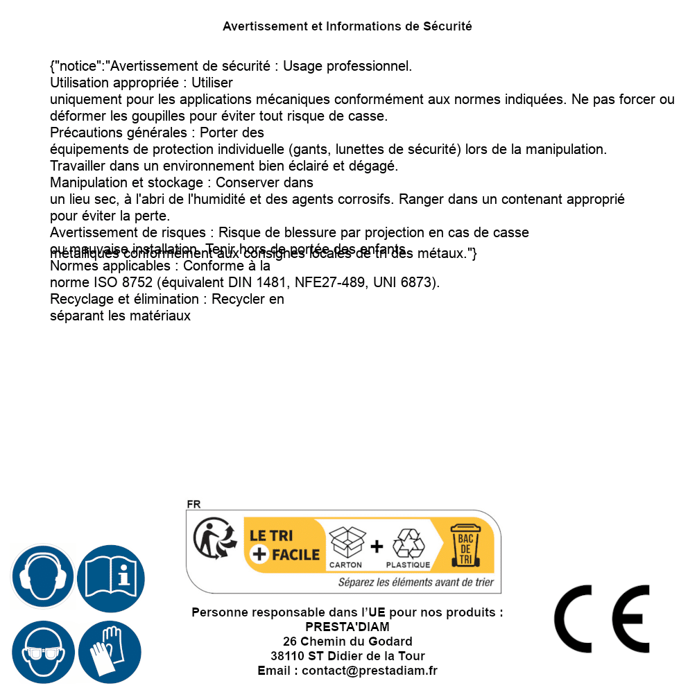 | AVERTISSEMENT et SECURITE | Identification de la personne responsable dans l’UE : Nom : PRESTA'DIAM. Adresse : 26 Chemin du Godard, 38110 ST Didier de la Tour (France). Email : contact@prestadiam.fr. |