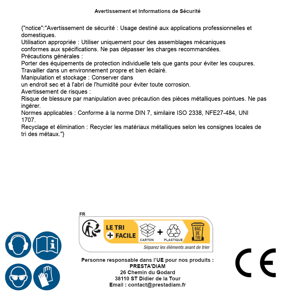 | AVERTISSEMENT et SECURITE | Identification de la personne responsable dans l’UE : Nom : PRESTA'DIAM. Adresse : 26 Chemin du Godard, 38110 ST Didier de la Tour (France). Email : contact@prestadiam.fr. |