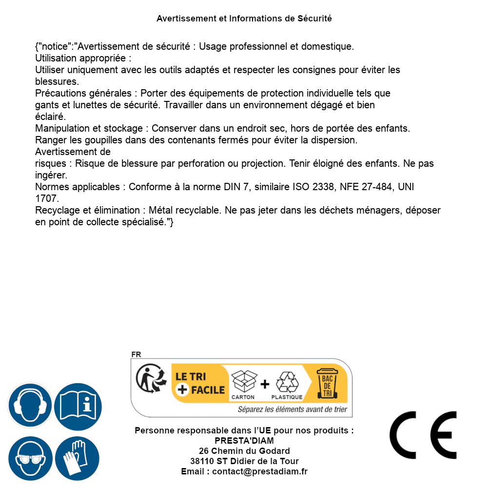 | AVERTISSEMENT et SECURITE | Identification de la personne responsable dans l’UE : Nom : PRESTA'DIAM. Adresse : 26 Chemin du Godard, 38110 ST Didier de la Tour (France). Email : contact@prestadiam.fr. |