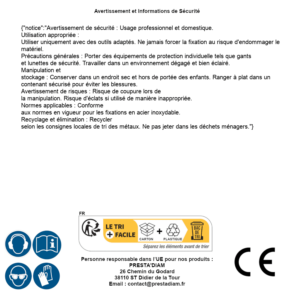 | AVERTISSEMENT et SECURITE | Identification de la personne responsable dans l’UE : Nom : PRESTA'DIAM. Adresse : 26 Chemin du Godard, 38110 ST Didier de la Tour (France). Email : contact@prestadiam.fr. |