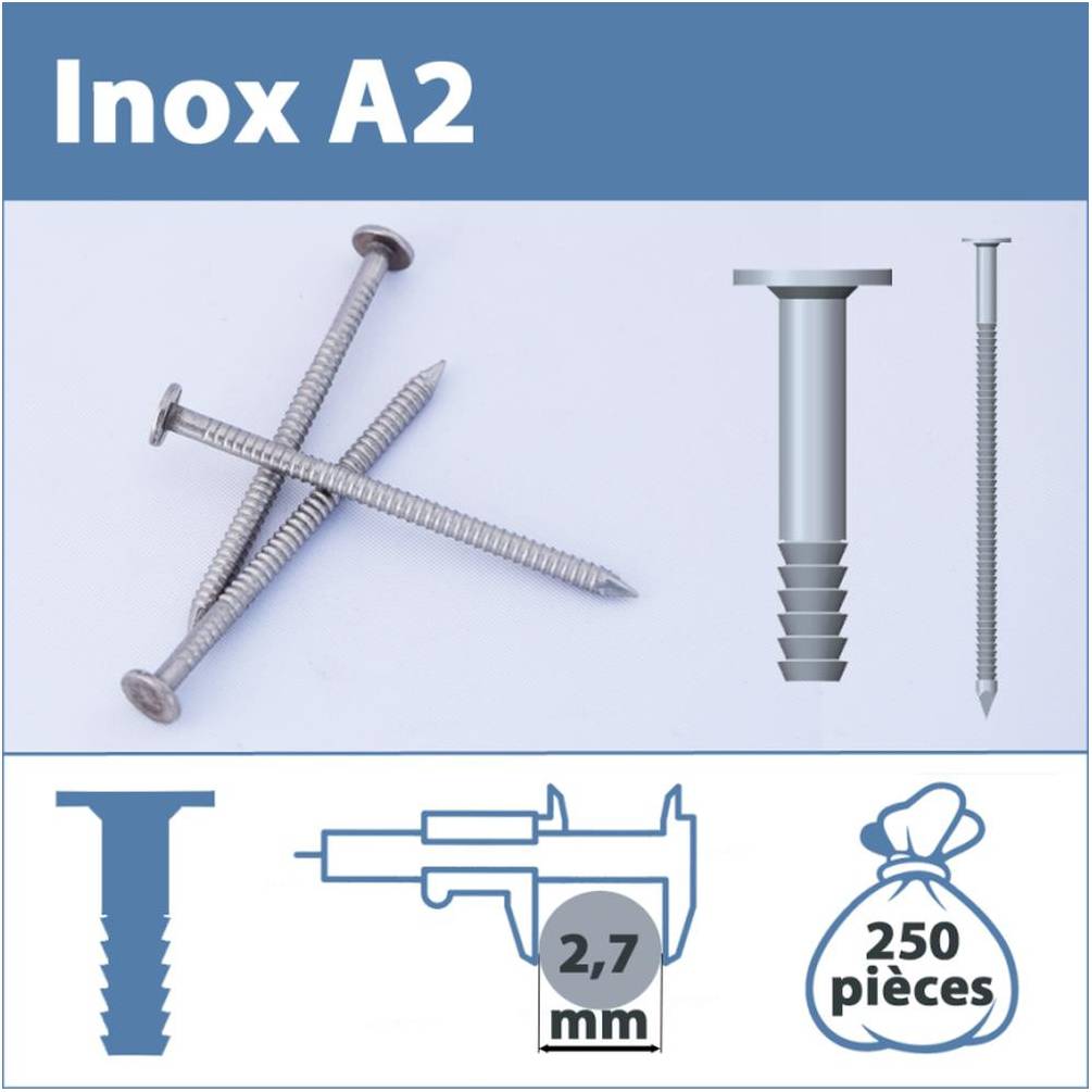 Ces pointes annelées à tête plate en inox A2 mesurent 2,7 mm de diamètre pour 70 mm de longueur. Conditionnées en lot de 250 pièces, elles sont idéales pour des fixations solides et durables, notamment en milieu humide grâce à leur résistance à la corrosion.