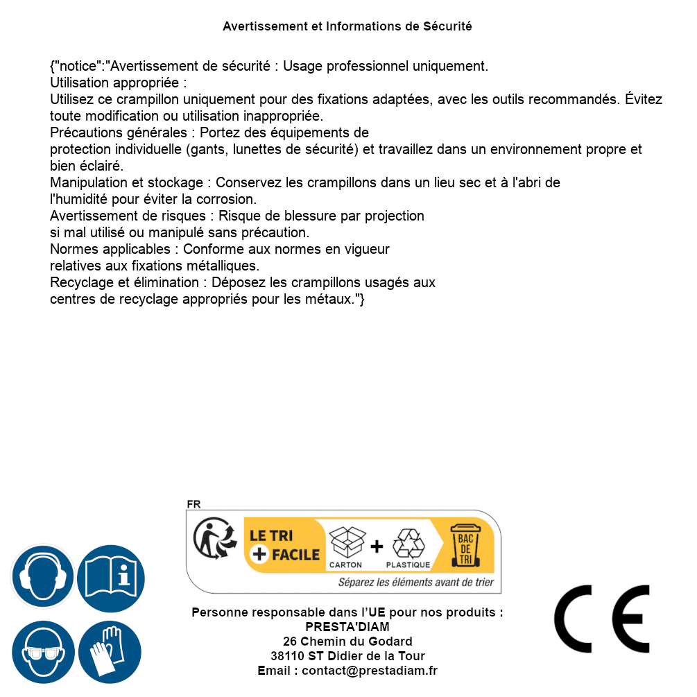 | AVERTISSEMENT et SECURITE | Identification de la personne responsable dans l’UE : Nom : PRESTA'DIAM. Adresse : 26 Chemin du Godard, 38110 ST Didier de la Tour (France). Email : contact@prestadiam.fr. |