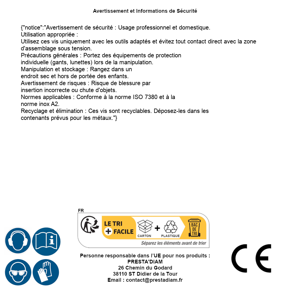 | AVERTISSEMENT et SECURITE | Identification de la personne responsable dans l’UE : Nom : PRESTA'DIAM. Adresse : 26 Chemin du Godard, 38110 ST Didier de la Tour (France). Email : contact@prestadiam.fr. |