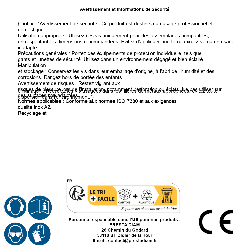 | AVERTISSEMENT et SECURITE | Identification de la personne responsable dans l’UE : Nom : PRESTA'DIAM. Adresse : 26 Chemin du Godard, 38110 ST Didier de la Tour (France). Email : contact@prestadiam.fr. |