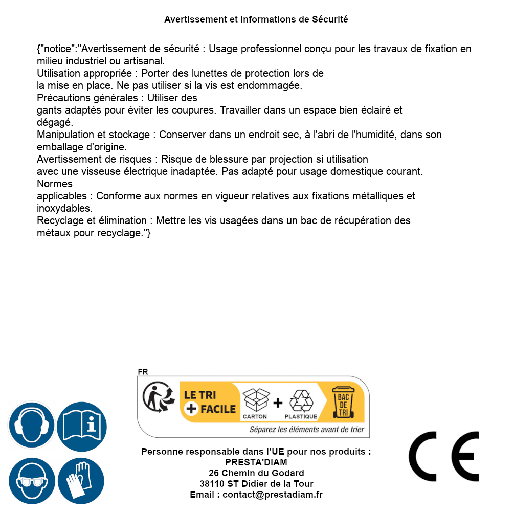 | AVERTISSEMENT et SECURITE | Identification de la personne responsable dans l’UE : Nom : PRESTA'DIAM. Adresse : 26 Chemin du Godard, 38110 ST Didier de la Tour (France). Email : contact@prestadiam.fr. |