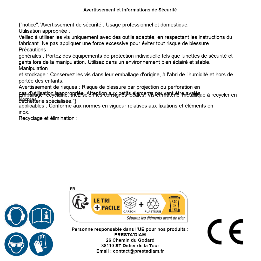 | AVERTISSEMENT et SECURITE | Identification de la personne responsable dans l’UE : Nom : PRESTA'DIAM. Adresse : 26 Chemin du Godard, 38110 ST Didier de la Tour (France). Email : contact@prestadiam.fr. |