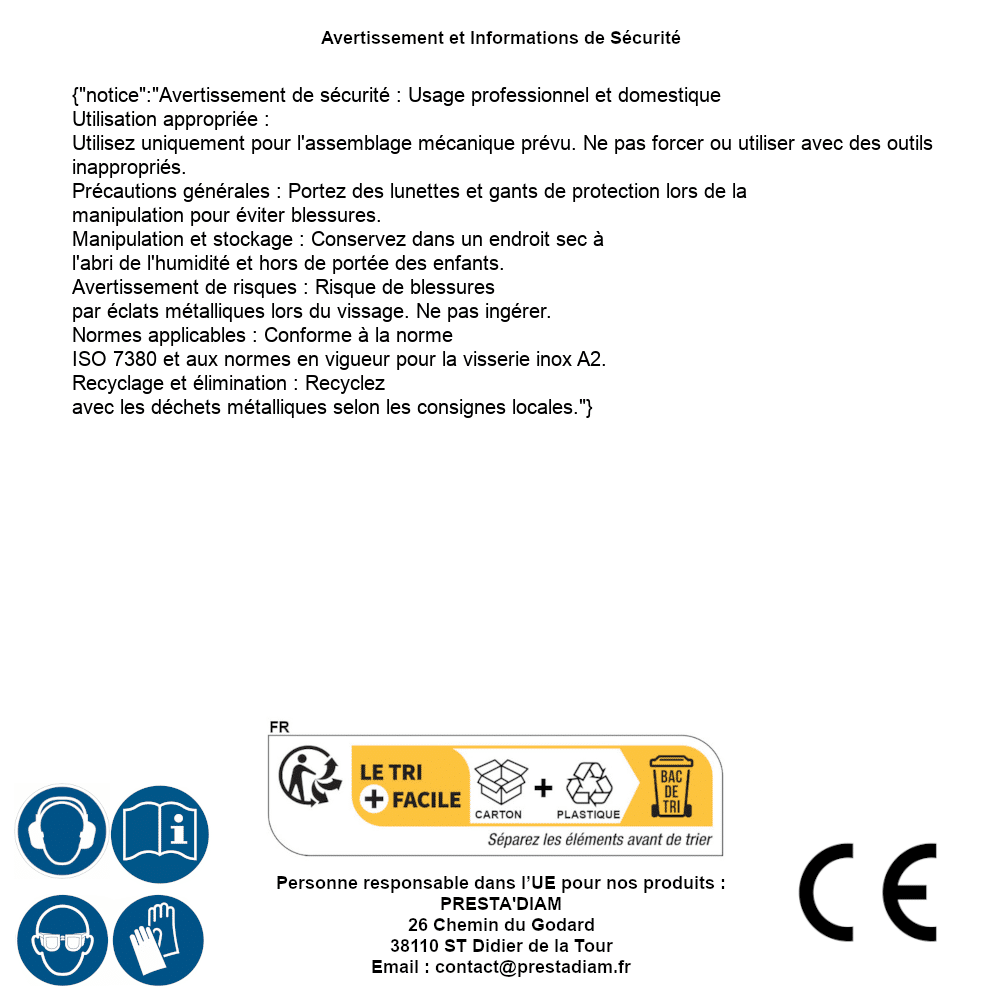 | AVERTISSEMENT et SECURITE | Identification de la personne responsable dans l’UE : Nom : PRESTA'DIAM. Adresse : 26 Chemin du Godard, 38110 ST Didier de la Tour (France). Email : contact@prestadiam.fr. |