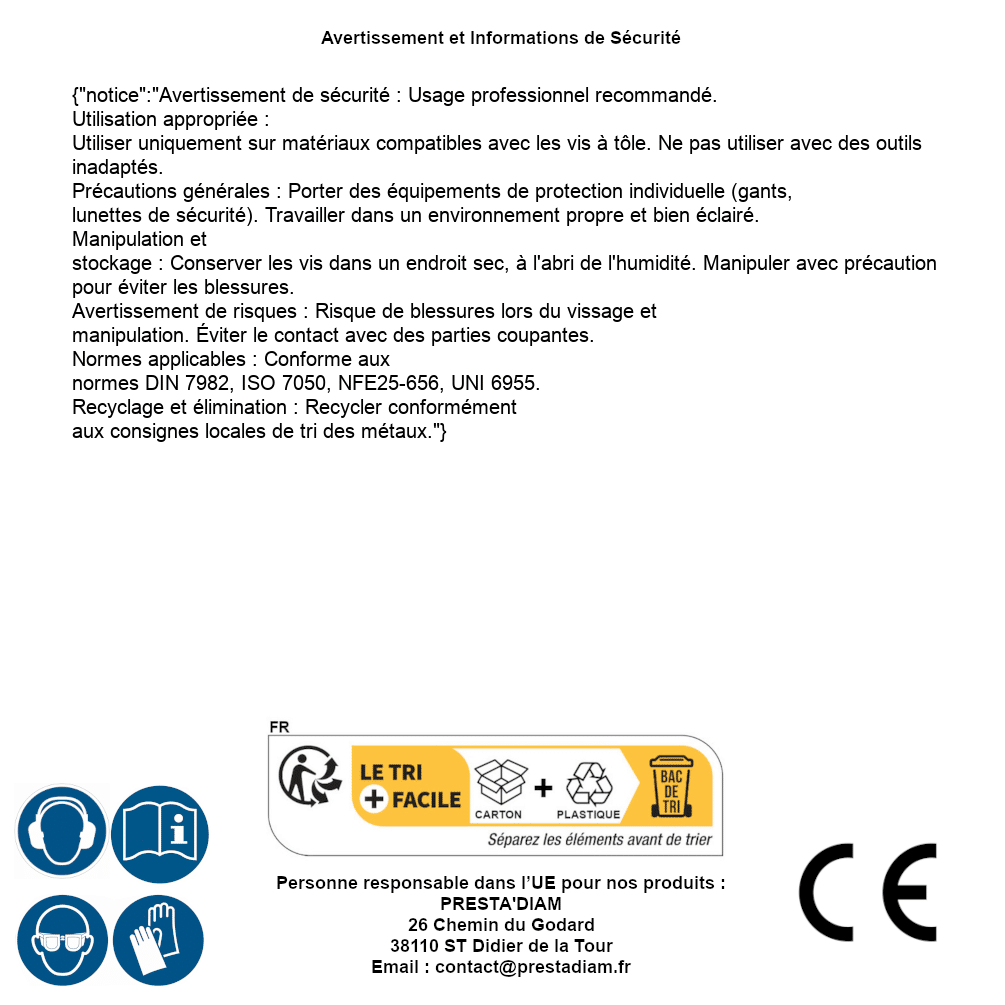 | AVERTISSEMENT et SECURITE | Identification de la personne responsable dans l’UE : Nom : PRESTA'DIAM. Adresse : 26 Chemin du Godard, 38110 ST Didier de la Tour (France). Email : contact@prestadiam.fr. |