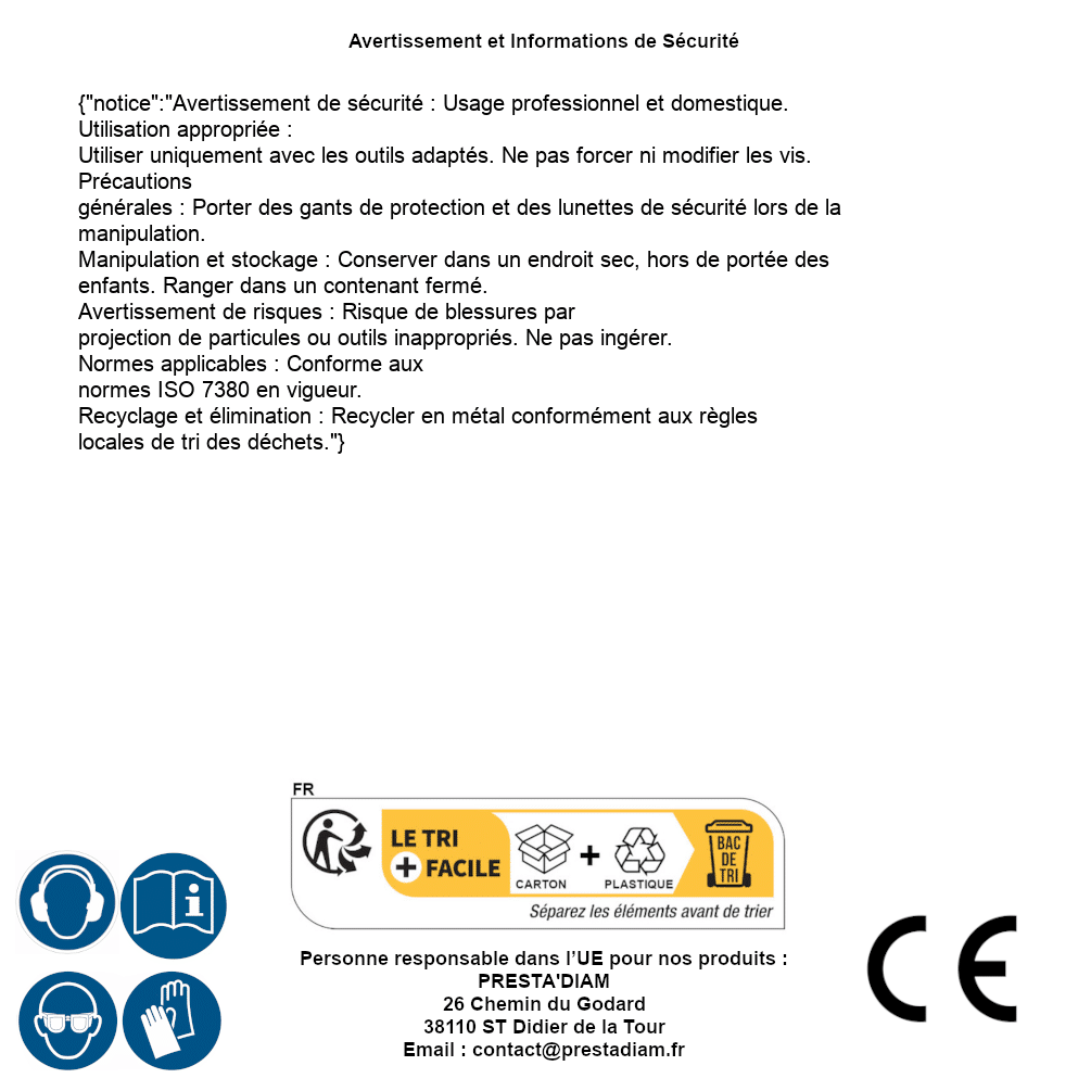 | AVERTISSEMENT et SECURITE | Identification de la personne responsable dans l’UE : Nom : PRESTA'DIAM. Adresse : 26 Chemin du Godard, 38110 ST Didier de la Tour (France). Email : contact@prestadiam.fr. |