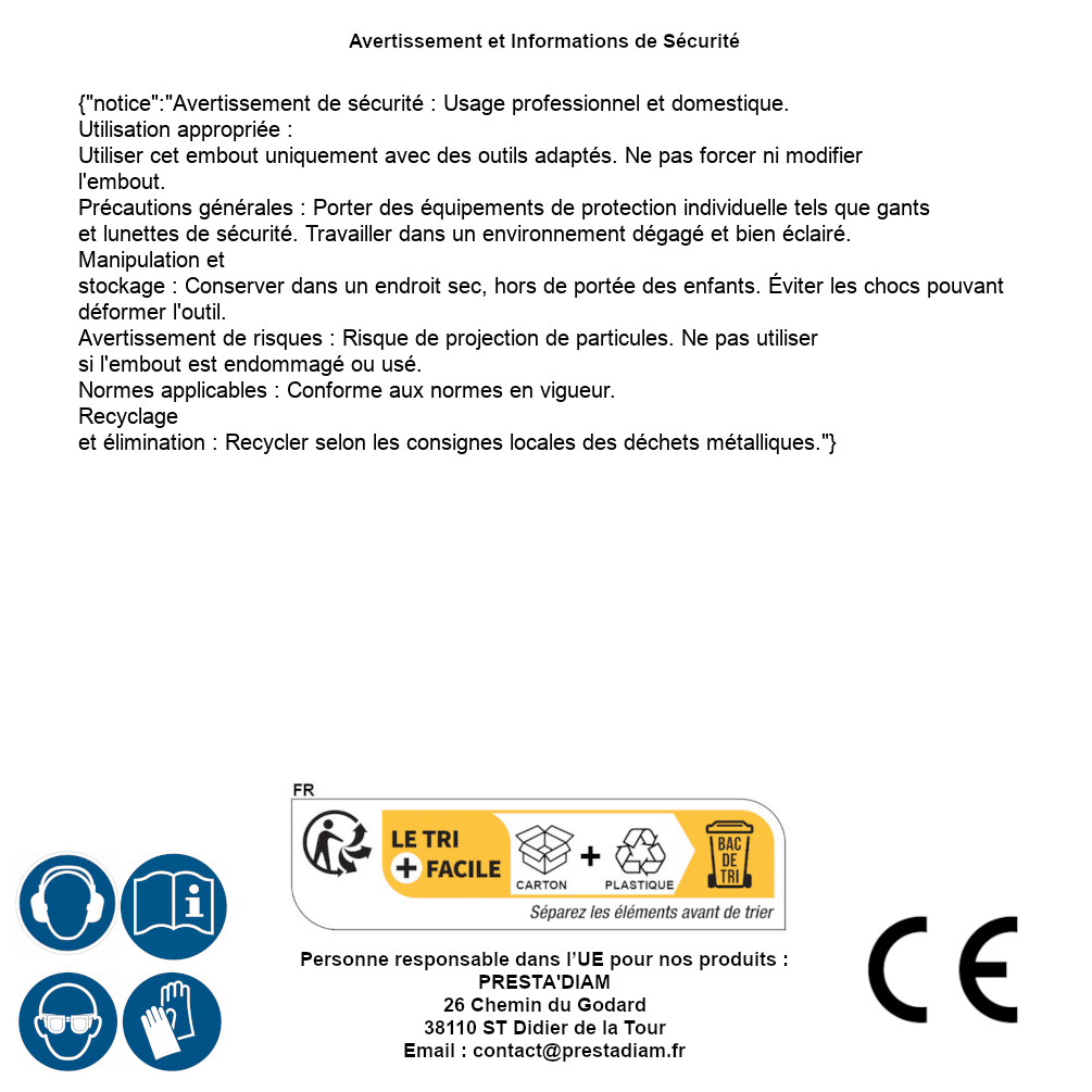 | AVERTISSEMENT et SECURITE | Identification de la personne responsable dans l’UE : Nom : PRESTA'DIAM. Adresse : 26 Chemin du Godard, 38110 ST Didier de la Tour (France). Email : contact@prestadiam.fr. |