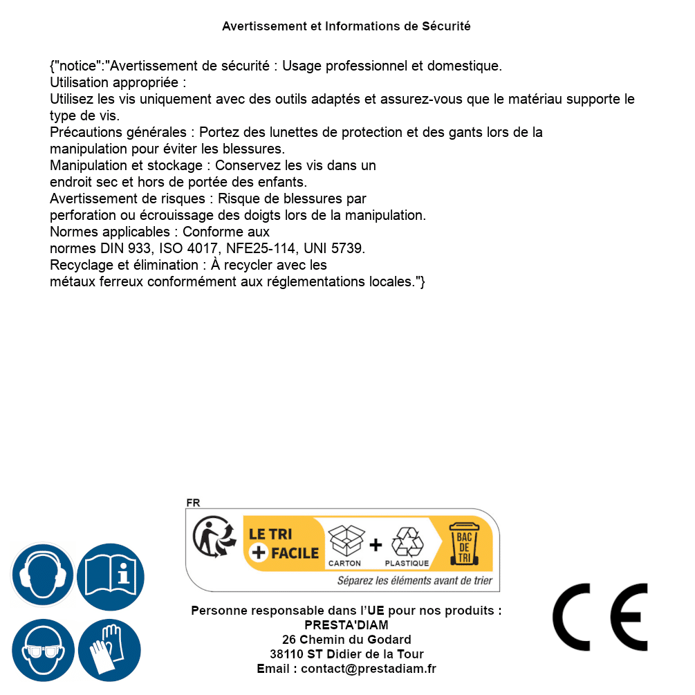 | AVERTISSEMENT et SECURITE | Identification de la personne responsable dans l’UE : Nom : PRESTA'DIAM. Adresse : 26 Chemin du Godard, 38110 ST Didier de la Tour (France). Email : contact@prestadiam.fr. |
