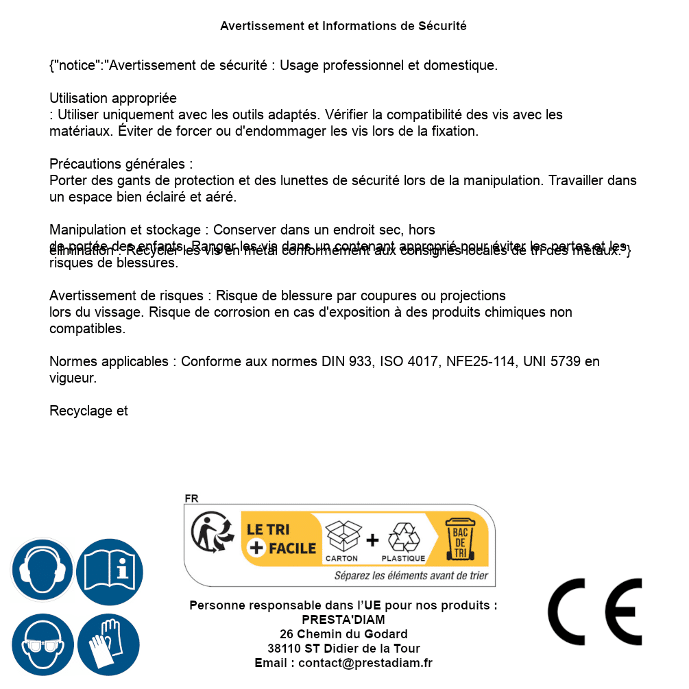 | AVERTISSEMENT et SECURITE | Identification de la personne responsable dans l’UE : Nom : PRESTA'DIAM. Adresse : 26 Chemin du Godard, 38110 ST Didier de la Tour (France). Email : contact@prestadiam.fr. |
