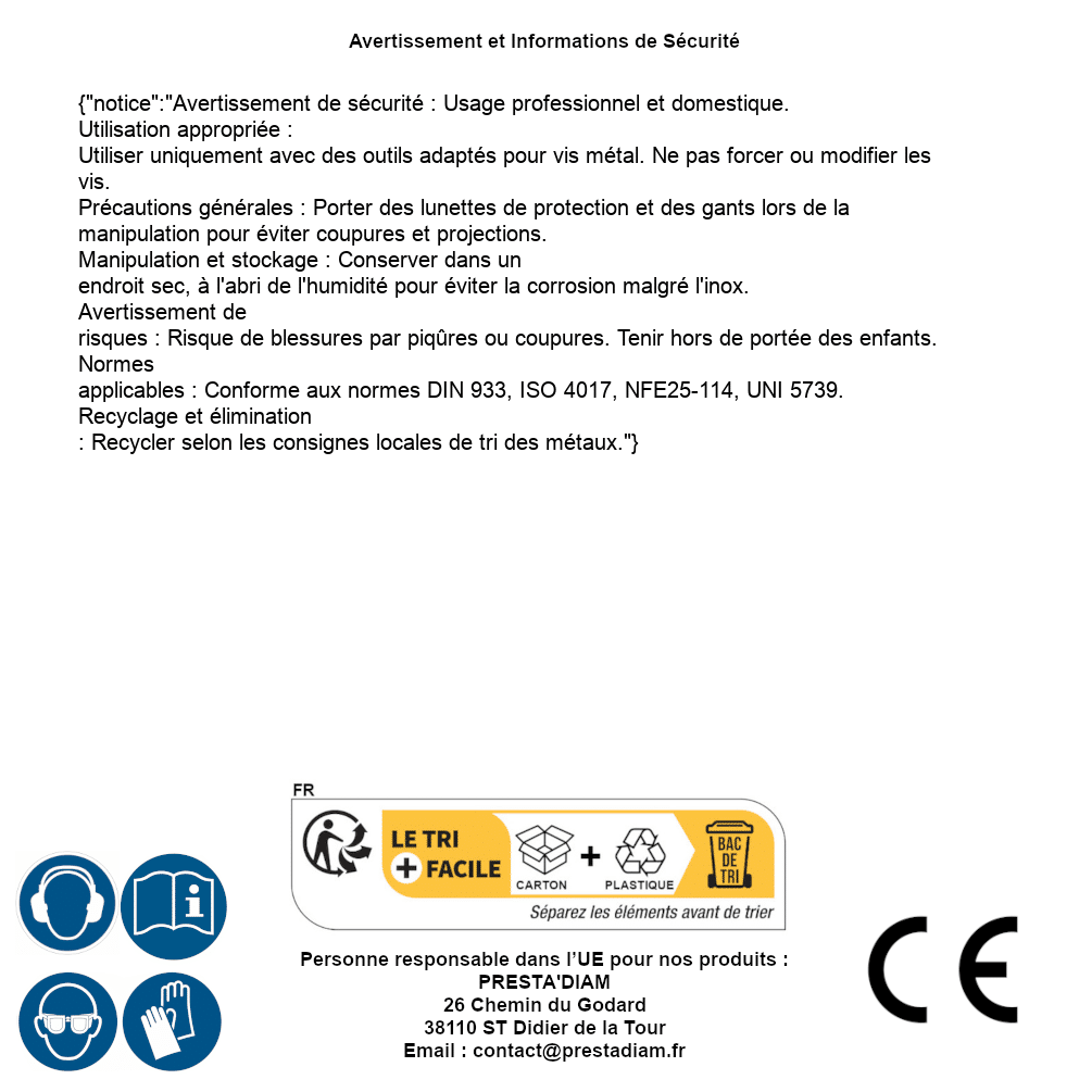 | AVERTISSEMENT et SECURITE | Identification de la personne responsable dans l’UE : Nom : PRESTA'DIAM. Adresse : 26 Chemin du Godard, 38110 ST Didier de la Tour (France). Email : contact@prestadiam.fr. |
