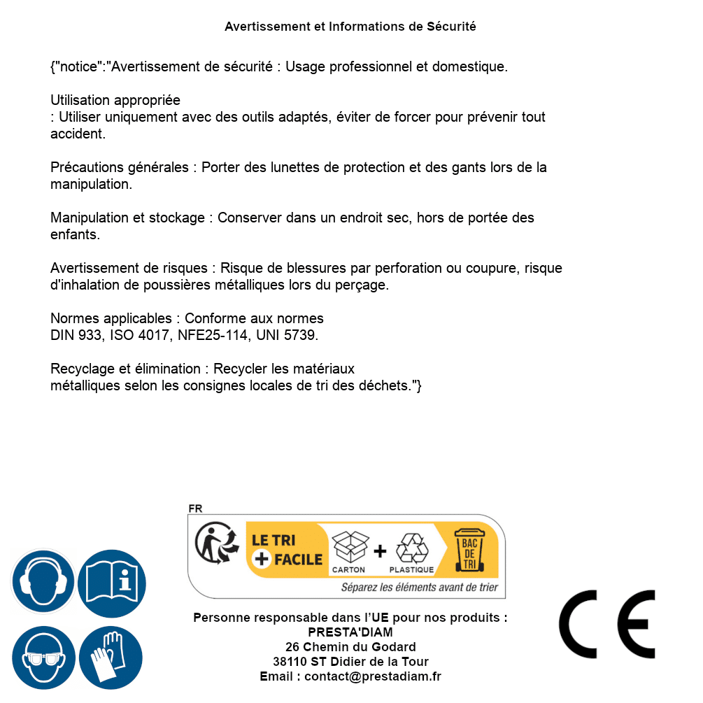 | AVERTISSEMENT et SECURITE | Identification de la personne responsable dans l’UE : Nom : PRESTA'DIAM. Adresse : 26 Chemin du Godard, 38110 ST Didier de la Tour (France). Email : contact@prestadiam.fr. |