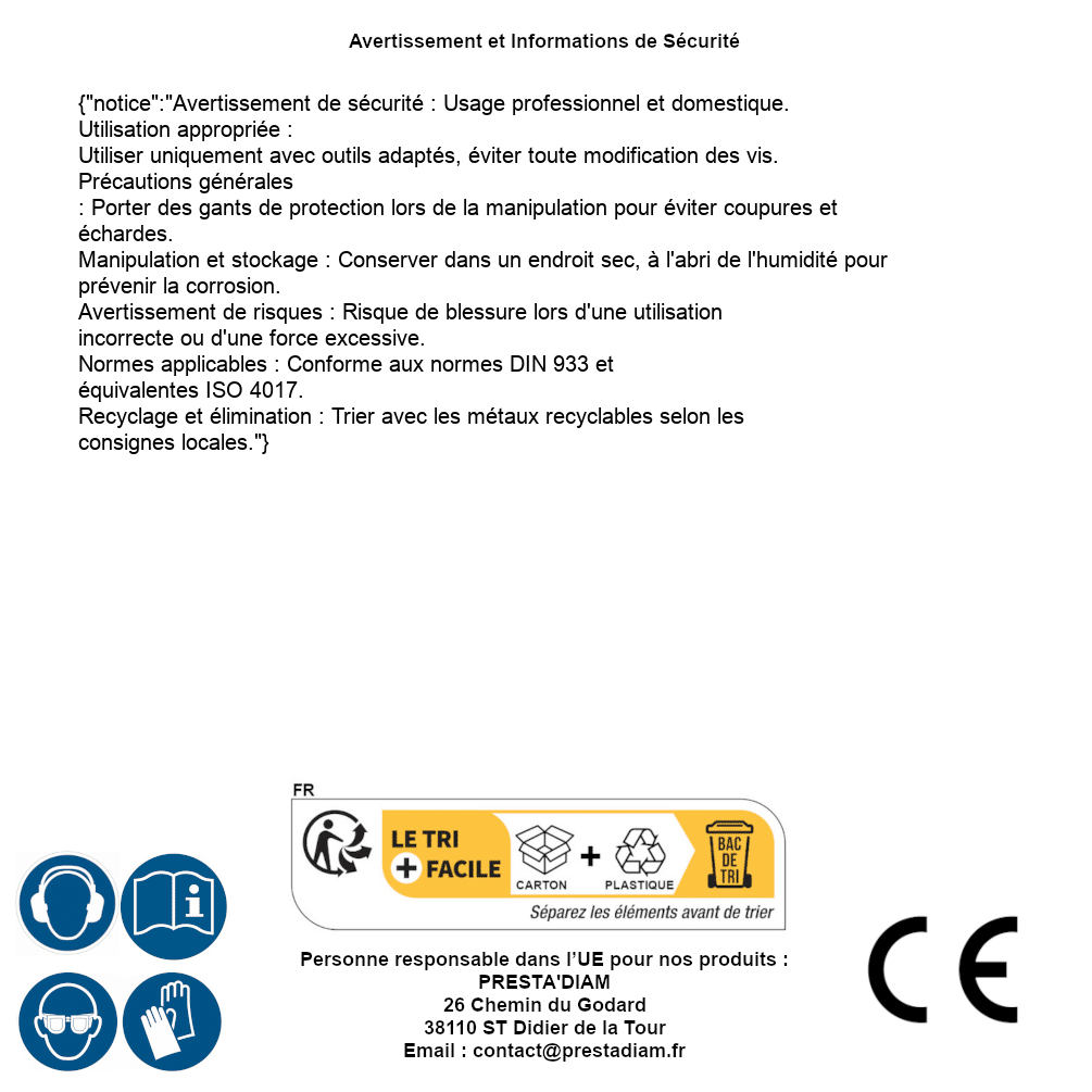 | AVERTISSEMENT et SECURITE | Identification de la personne responsable dans l’UE : Nom : PRESTA'DIAM. Adresse : 26 Chemin du Godard, 38110 ST Didier de la Tour (France). Email : contact@prestadiam.fr. |