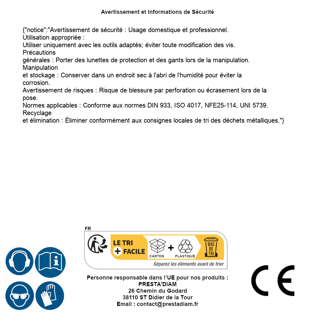 | AVERTISSEMENT et SECURITE | Identification de la personne responsable dans l’UE : Nom : PRESTA'DIAM. Adresse : 26 Chemin du Godard, 38110 ST Didier de la Tour (France). Email : contact@prestadiam.fr. |