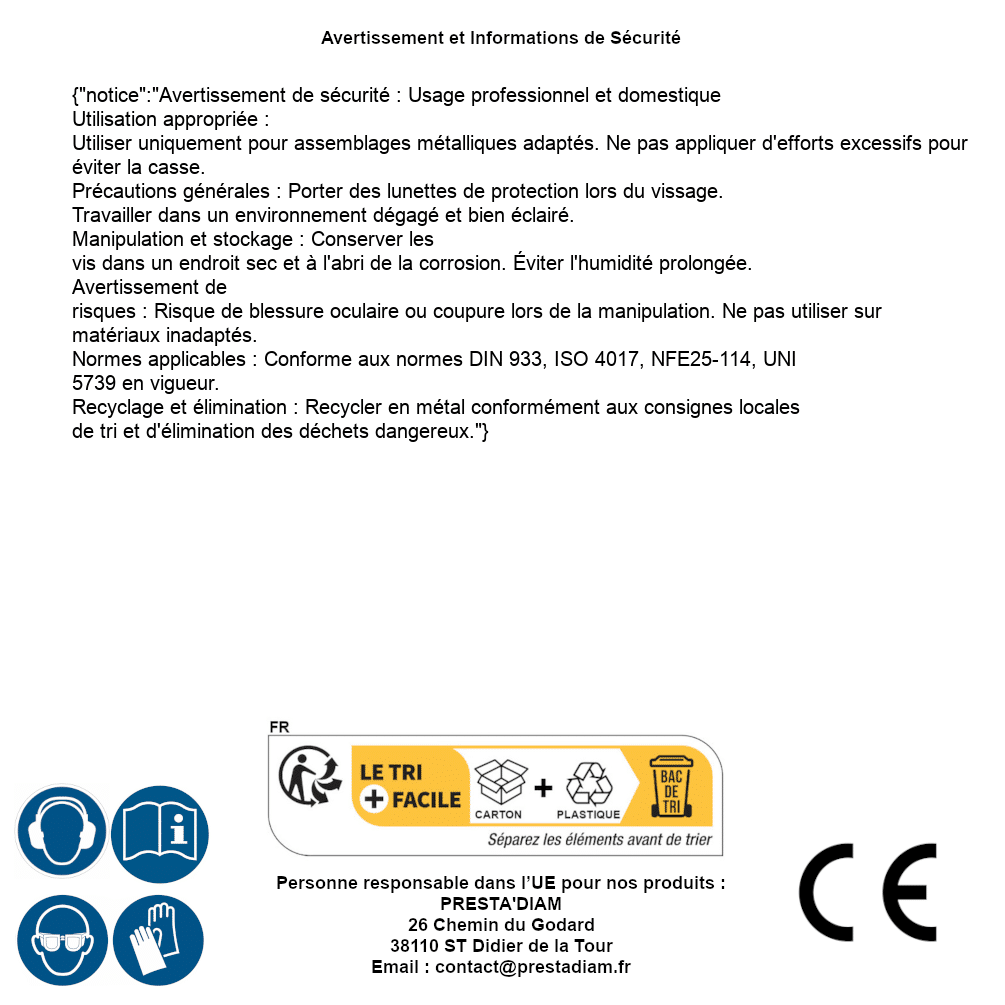 | AVERTISSEMENT et SECURITE | Identification de la personne responsable dans l’UE : Nom : PRESTA'DIAM. Adresse : 26 Chemin du Godard, 38110 ST Didier de la Tour (France). Email : contact@prestadiam.fr. |