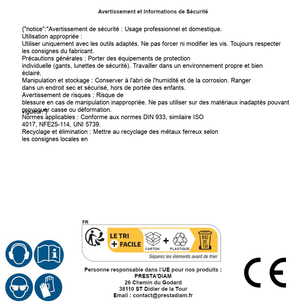 | AVERTISSEMENT et SECURITE | Identification de la personne responsable dans l’UE : Nom : PRESTA'DIAM. Adresse : 26 Chemin du Godard, 38110 ST Didier de la Tour (France). Email : contact@prestadiam.fr. |
