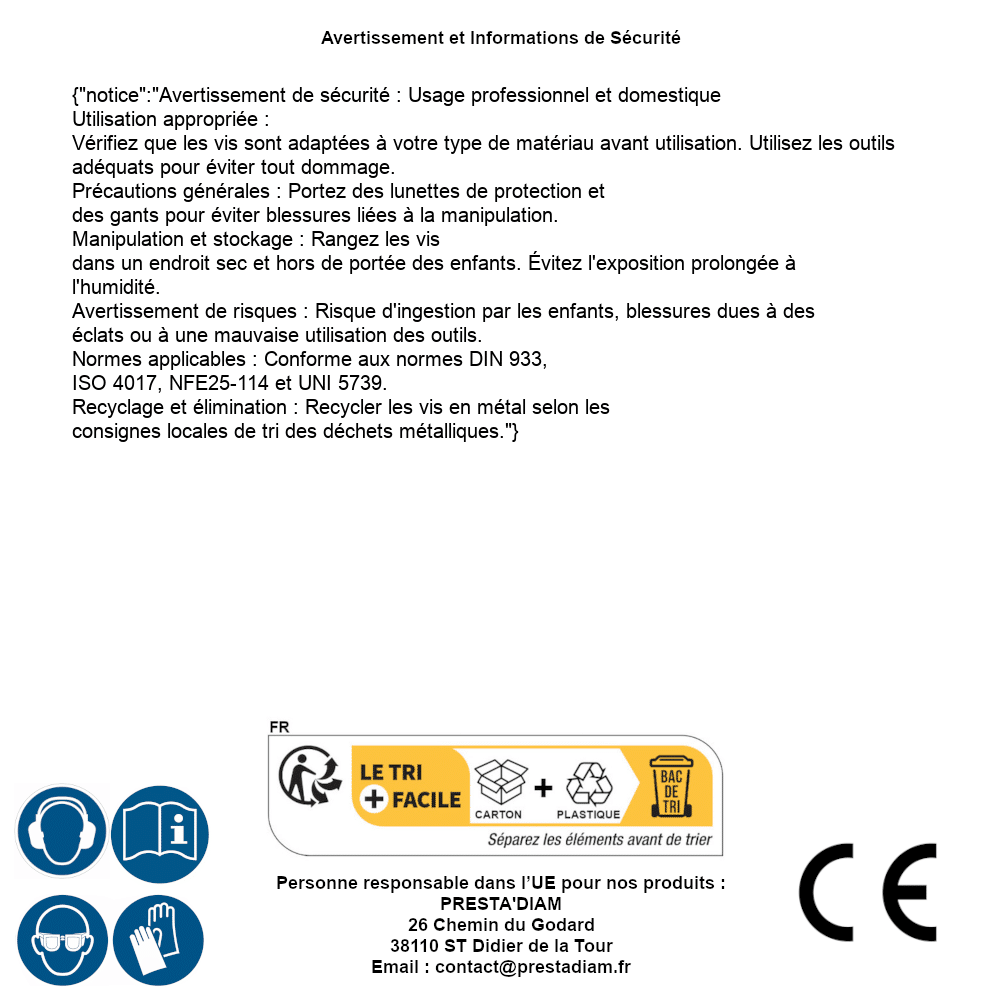 | AVERTISSEMENT et SECURITE | Identification de la personne responsable dans l’UE : Nom : PRESTA'DIAM. Adresse : 26 Chemin du Godard, 38110 ST Didier de la Tour (France). Email : contact@prestadiam.fr. |