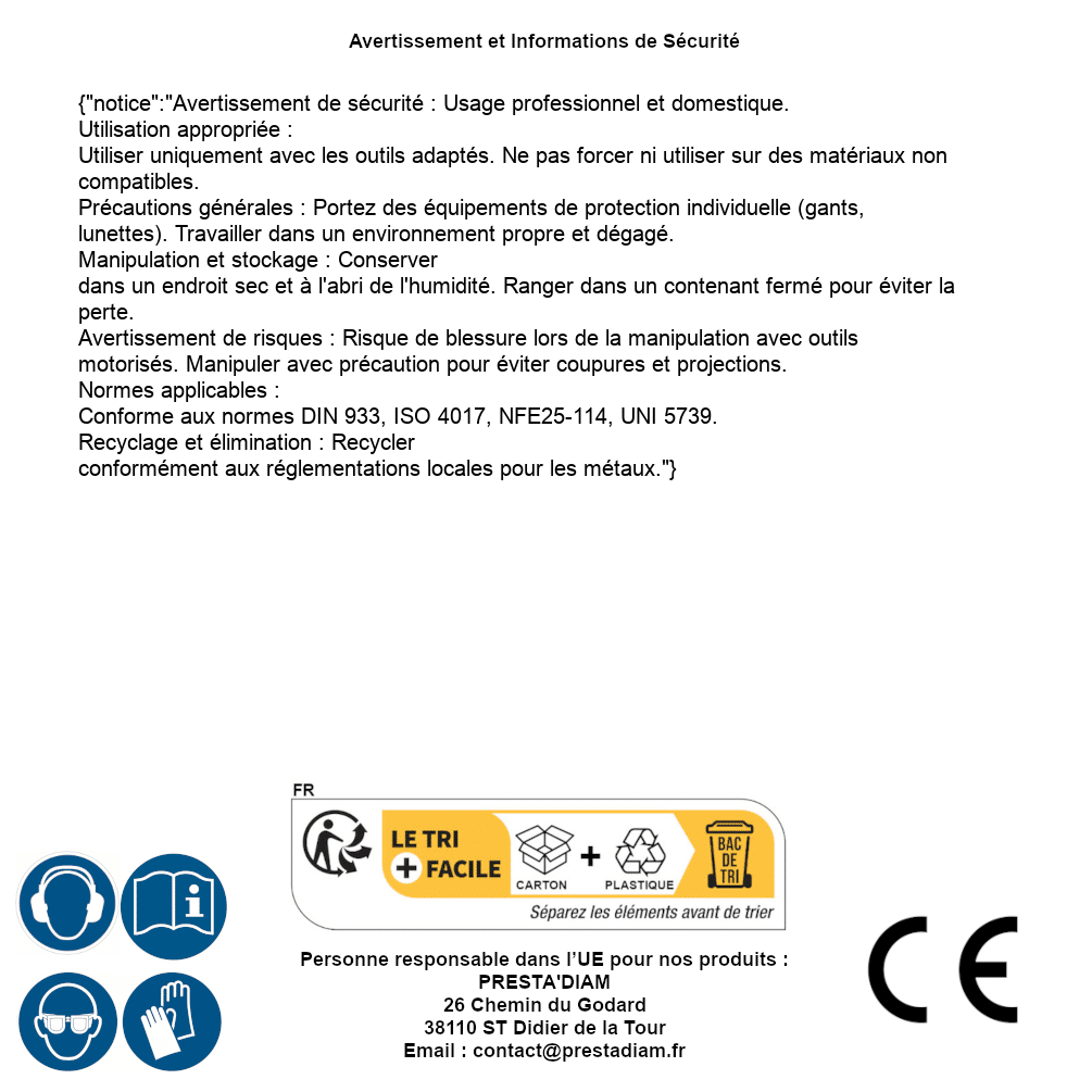 | AVERTISSEMENT et SECURITE | Identification de la personne responsable dans l’UE : Nom : PRESTA'DIAM. Adresse : 26 Chemin du Godard, 38110 ST Didier de la Tour (France). Email : contact@prestadiam.fr. |