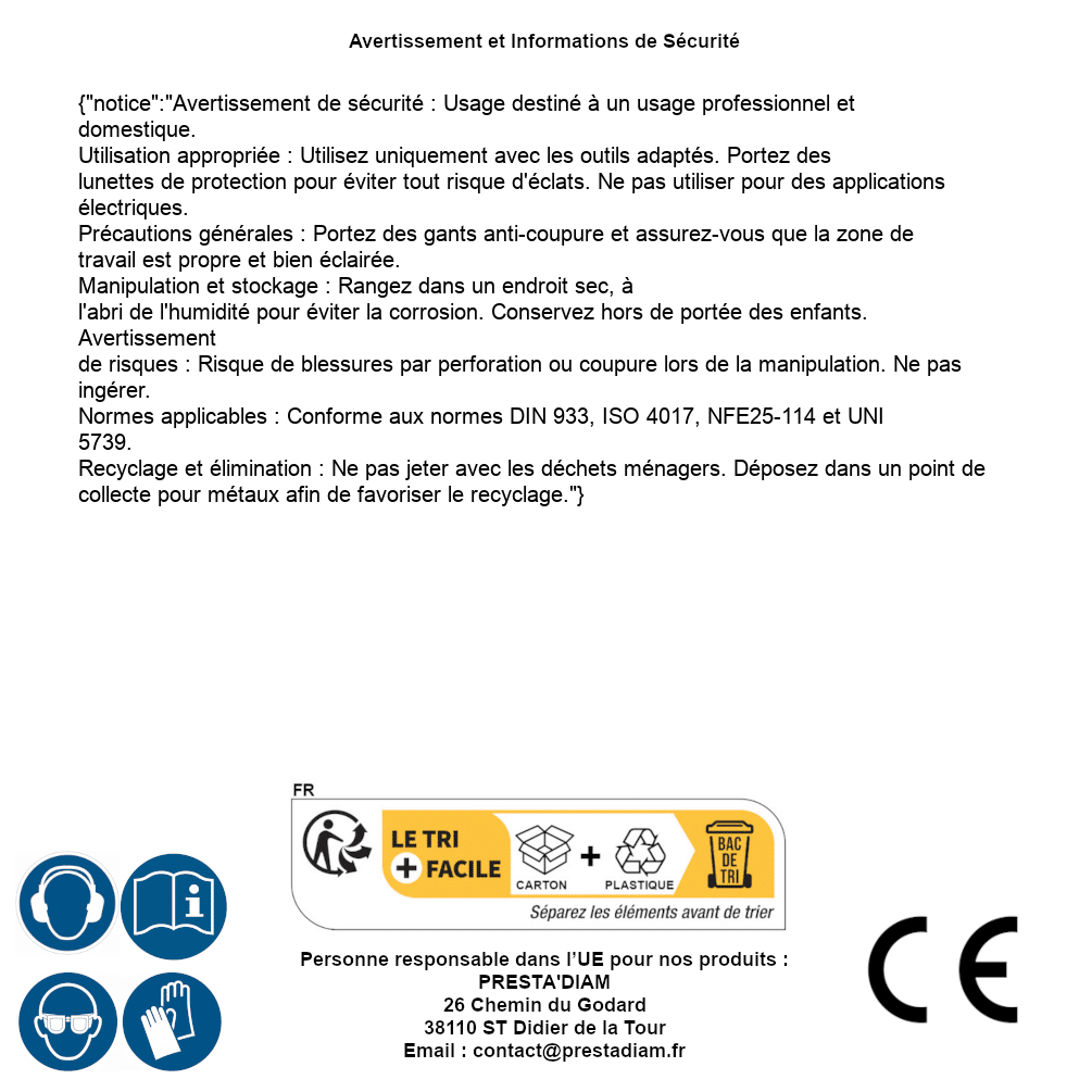 | AVERTISSEMENT et SECURITE | Identification de la personne responsable dans l’UE : Nom : PRESTA'DIAM. Adresse : 26 Chemin du Godard, 38110 ST Didier de la Tour (France). Email : contact@prestadiam.fr. |