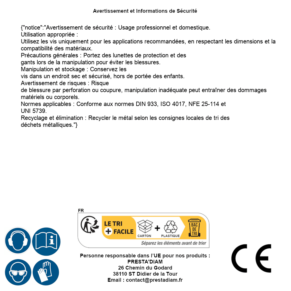 | AVERTISSEMENT et SECURITE | Identification de la personne responsable dans l’UE : Nom : PRESTA'DIAM. Adresse : 26 Chemin du Godard, 38110 ST Didier de la Tour (France). Email : contact@prestadiam.fr. |