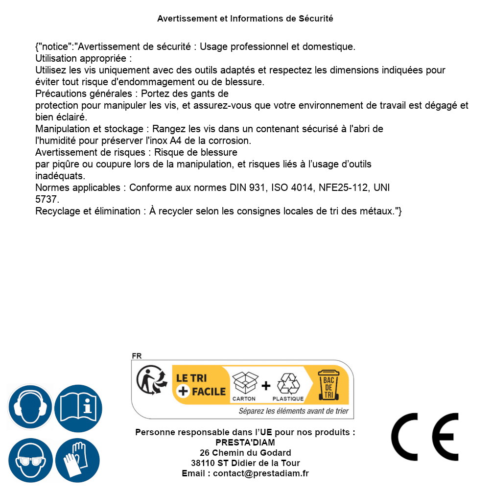 | AVERTISSEMENT et SECURITE | Identification de la personne responsable dans l’UE : Nom : PRESTA'DIAM. Adresse : 26 Chemin du Godard, 38110 ST Didier de la Tour (France). Email : contact@prestadiam.fr. |