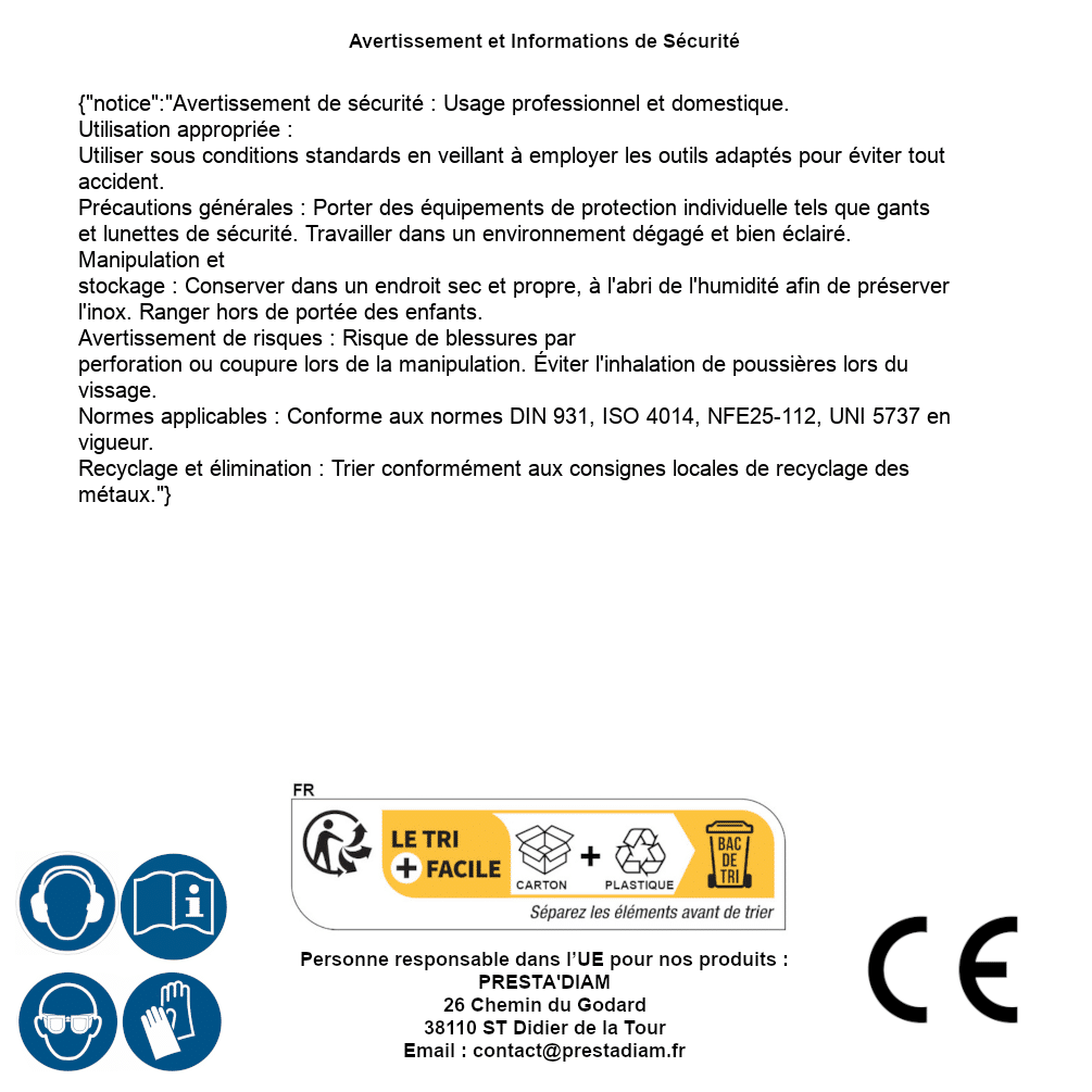 | AVERTISSEMENT et SECURITE | Identification de la personne responsable dans l’UE : Nom : PRESTA'DIAM. Adresse : 26 Chemin du Godard, 38110 ST Didier de la Tour (France). Email : contact@prestadiam.fr. |