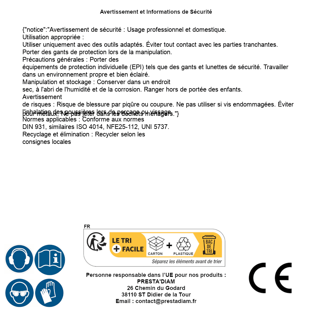 | AVERTISSEMENT et SECURITE | Identification de la personne responsable dans l’UE : Nom : PRESTA'DIAM. Adresse : 26 Chemin du Godard, 38110 ST Didier de la Tour (France). Email : contact@prestadiam.fr. |