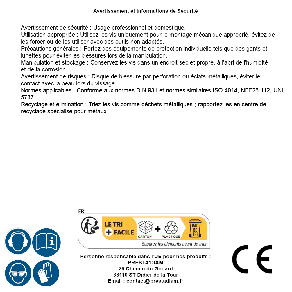 | AVERTISSEMENT et SECURITE | Identification de la personne responsable dans l’UE : Nom : PRESTA'DIAM. Adresse : 26 Chemin du Godard, 38110 ST Didier de la Tour (France). Email : contact@prestadiam.fr. |